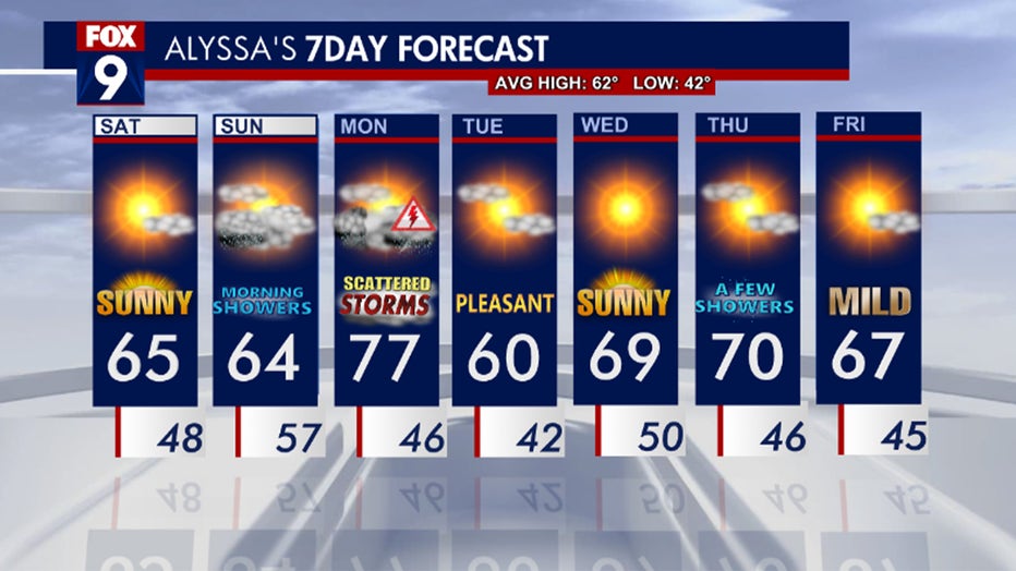 Sunshine all day will bring high temperatures to the mid-60s on Saturday, with showers expected to return on Sunday.