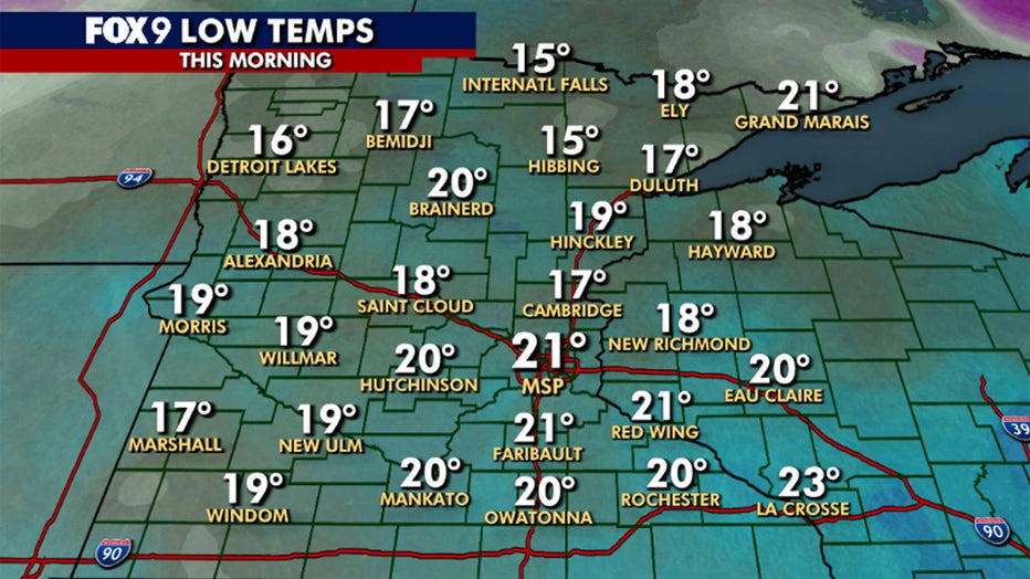 Low temperatures on Sunday morning. (FOX 9)