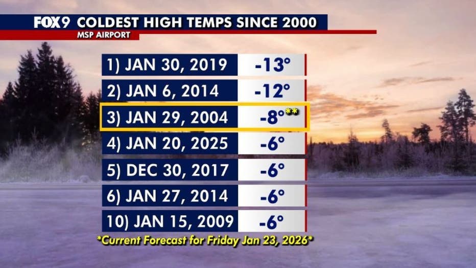 The record cold high temperature for Jan. 23 in the Twin Cities is 16 below zero, set in 1936. So while Friday's blast of frigid air will be dangerous, and doesn't happen all the often, it still won't break a record.