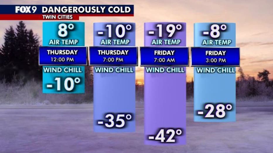 MINNEAPOLIS (FOX 9) - An extreme cold warning is in effect for Minnesota starting Thursday evening, when wind chills could reach 40 and 50 below zero in much of the state.
