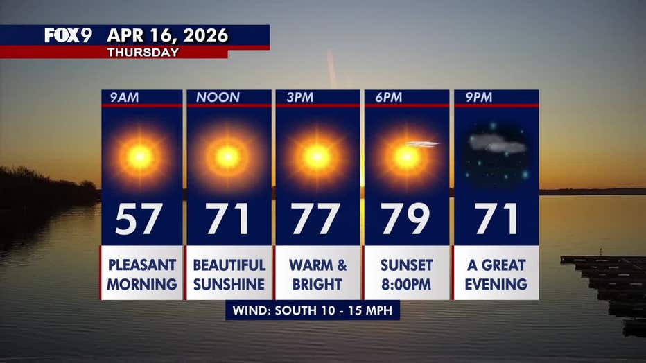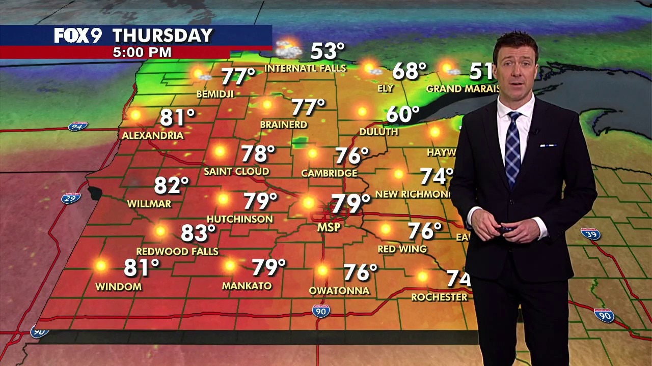 MINNEAPOLIS (FOX 9) - It’s a sunny and warm Thursday in Minnesota, with increasing southerly breezes and highs in the 70s and 80s.