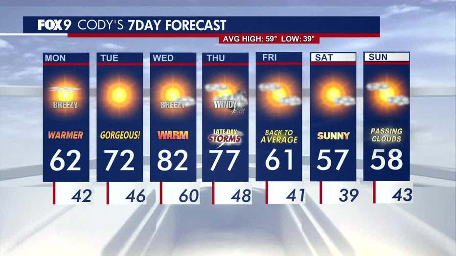 After a chilly start, expect a bright and warmer day on Monday with highs in the 60s. The warming trend continues through the week before a cool down arrives for the weekend. FOX 9 meteorologist Cody Matz has the forecast.