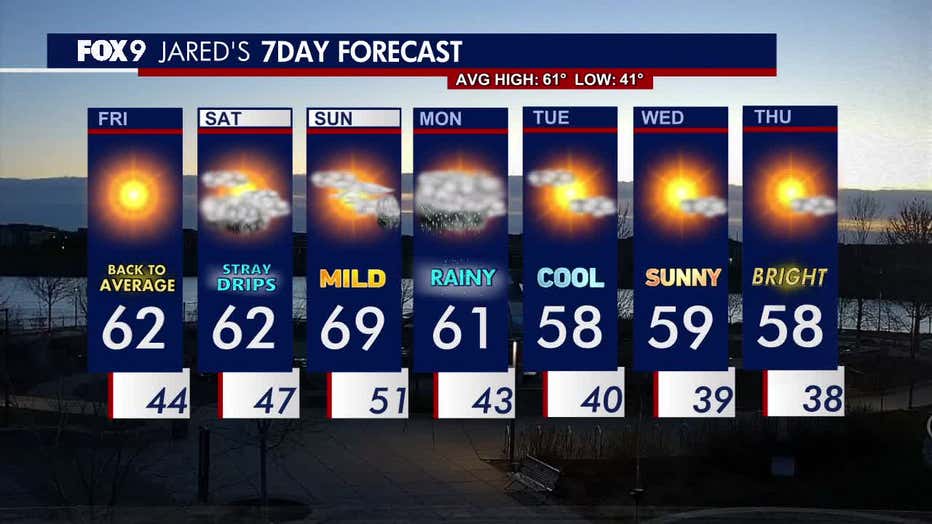 Friday will bring sunshine and seasonable temperatures across Minnesota, with highs in the lower 60s in the Twin Cities metro area. FOX 9 meteorologist Jared Piepenburg has the forecast.