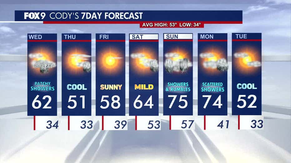 Expect a much warmer and breezy day on Wednesday before a cold front brings light isolated rain showers and cooler temperatures. FOX 9 meteorologist Cody Matz has the forecast.