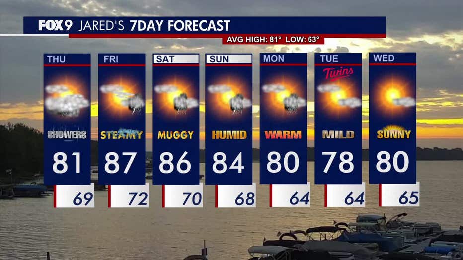 Expect periods of showers and rumbles through the afternoon and evening on Thursday with temperatures in the lower 80s. FOX 9 meteorologist Jared Piepenburg has the full forecast.