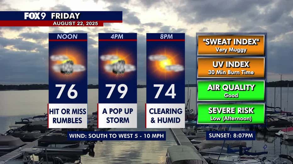 It's another warm and humid Friday with a chance for pop-up thundershowers in the afternoon. FOX 9 meteorologist Cody Matz has the full forecast.