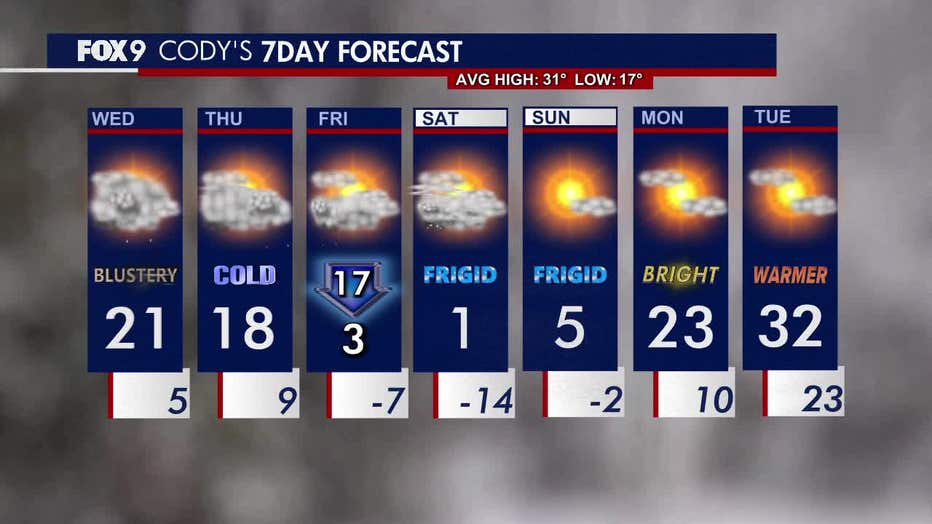 Wednesday stays cloudy and chilly with northwest winds of 10–20+ mph, creating a breezy afternoon, especially in southern Minnesota. Temperatures hold steady in the upper teens and low 20s across the state, with the Twin Cities metro reaching a daytime high of around 21 degrees.