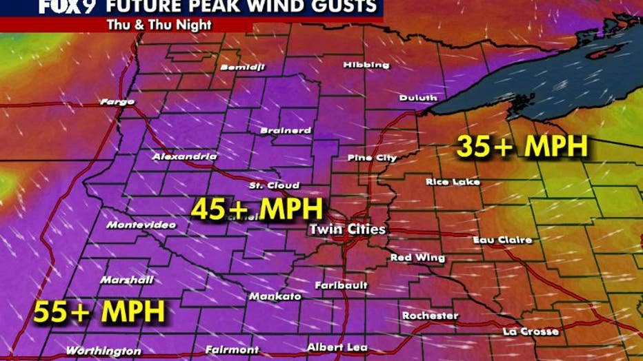 A wind advisory is in effect from 9 a.m. to 9 p.m. for parts of west central and southern Minnesota, where wind gusts may exceed 45 mph. Far southwestern and west central Minnesota are under a high wind warning from 9 a.m. to 6 p.m., with gusts potentially exceeding 55 mph.