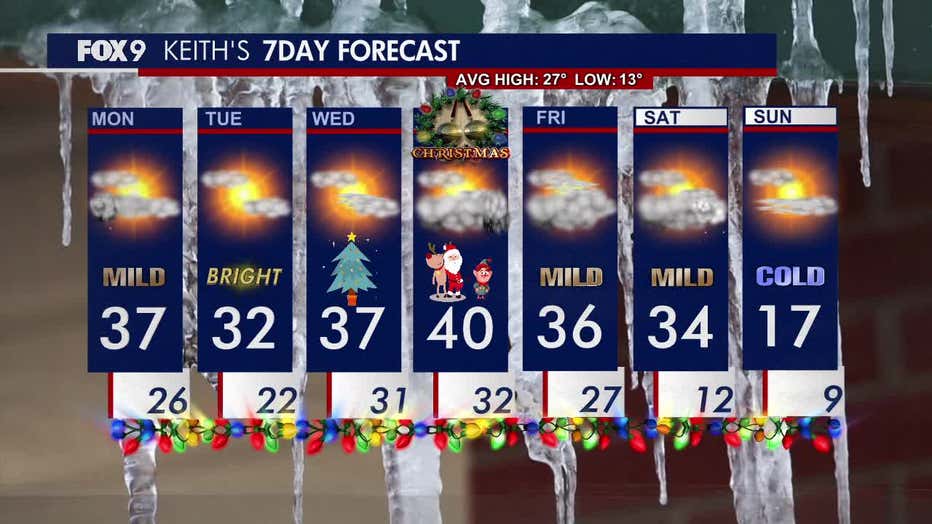 The mild trend continues into the holiday, with Christmas reaching a high of around 40 degrees in the Twin Cities metro. Temperatures cool slightly but remain above freezing Friday and Saturday before turning colder again by the end of the weekend.