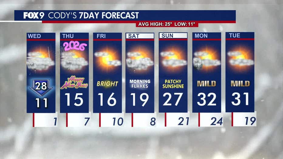 Wednesday morning will see a light dusting of snow before clearing for a brighter afternoon. Temperatures gradually fall for a chilly New Year's Eve. FOX 9 meteorologist Cody Matz has the full forecast.