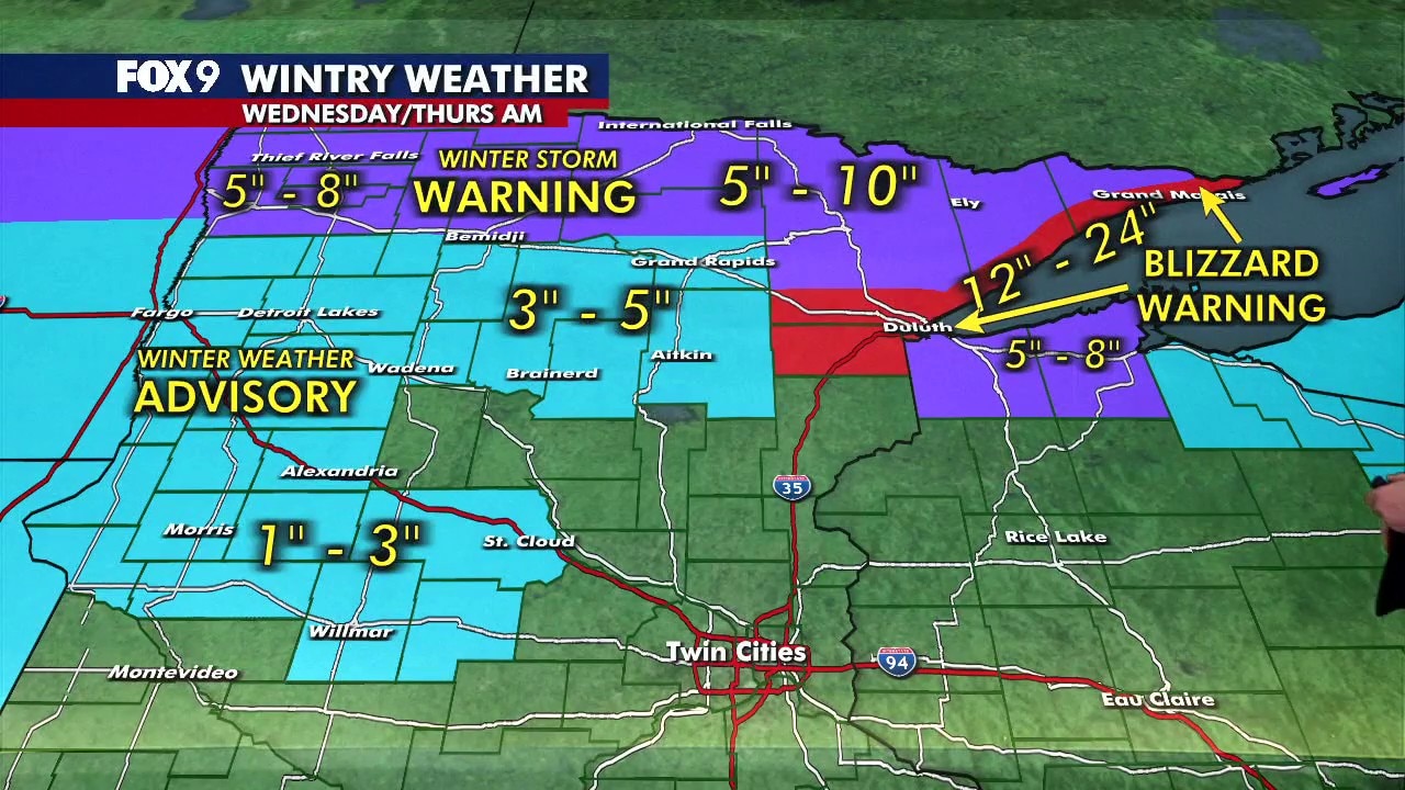 MINNEAPOLIS (FOX 9) - A winter storm is bringing rain and a messy wintry mix to the Twin Cities metro on Wednesday while producing heavy snowfall and blizzard conditions for northern Minnesota.
