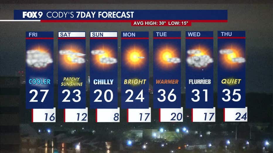 Expect a cooler, cloudy, and breezy day on Friday with temperatures hovering in the 20s. FOX 9 meteorologist Cody Matz has the full forecast.