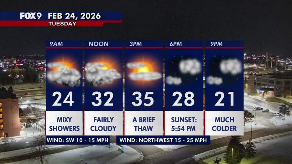 MINNEAPOLIS (FOX 9) - A light wintry mix and quick thaw will give way to falling temperatures and breezy conditions in the Twin Cities on Tuesday.