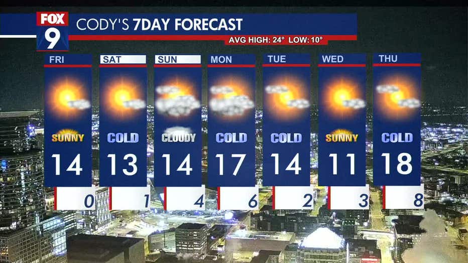 MINNEAPOLIS (FOX 9) - Expect a bright, sunny but cold day on Friday with temperatures in the teens.