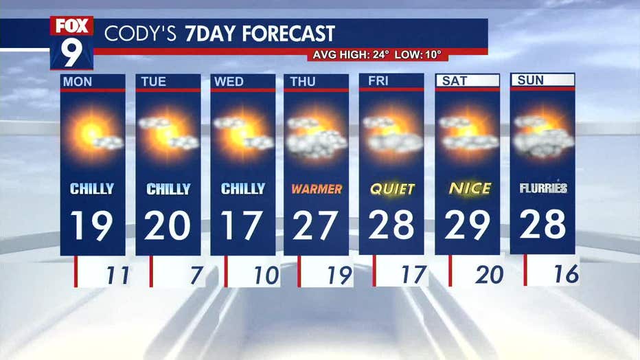 Monday morning will start with plenty of sunshine before clouds roll in by the afternoon. Temperatures remain chilly, with a daytime high of 19 degrees in the Twin Cities metro. FOX 9 meteorologist Cody Matz has your forecast.