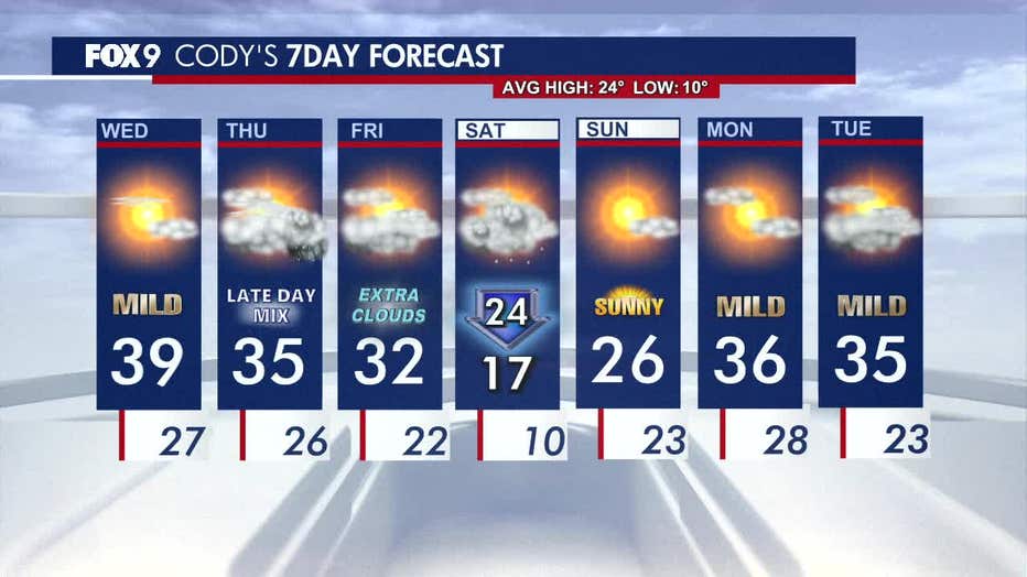 Patchy morning fog will clear, leaving a brighter, mild afternoon with highs in the upper 30s. FOX 9 meteorologist Cody Matz has the full forecast.