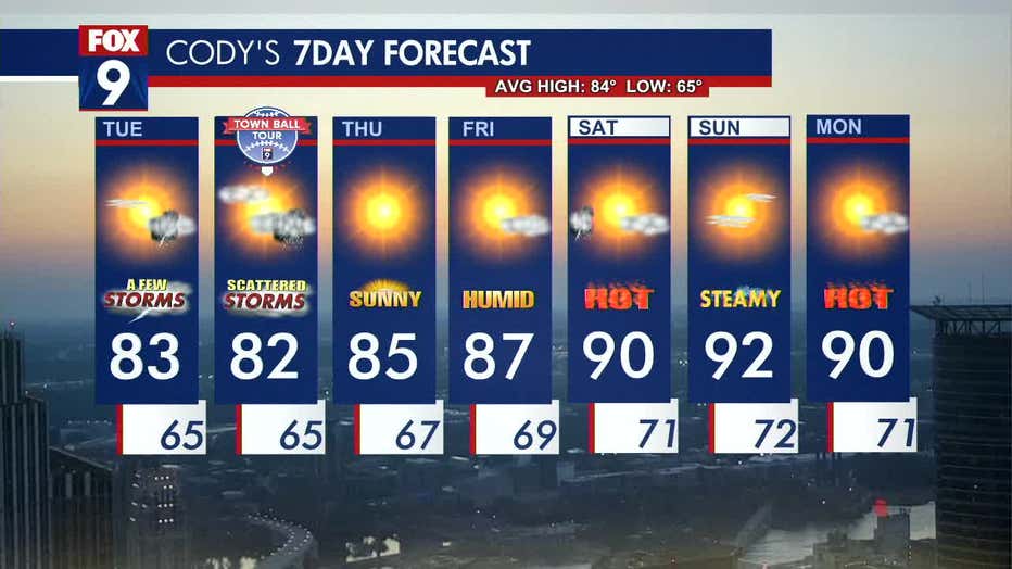 Tuesday will be more of the same, with highs in the 80s and chances for isolated storms in the afternoon and evening. Things will clear out by Thursday, and temperatures could heat up into the 90s later this week.