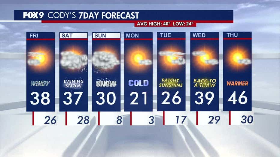 Morning gusty winds will gradually improve, along with a break in the clouds for some afternoon sunshine. The attention then shifts to an incoming winter storm this weekend. FOX 9 meteorologist Cody Matz has the forecast.