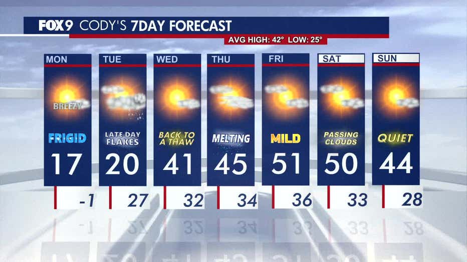 Expect a bright, breezy, and frigid day on Monday with highs in the teens and wind chills in the single digits. FOX 9 meteorologist Cody Matz has the full forecast.