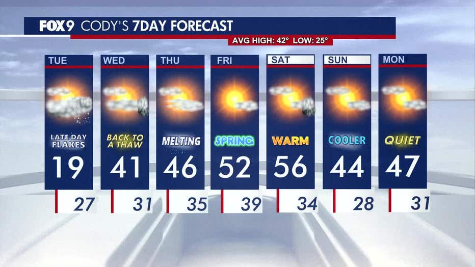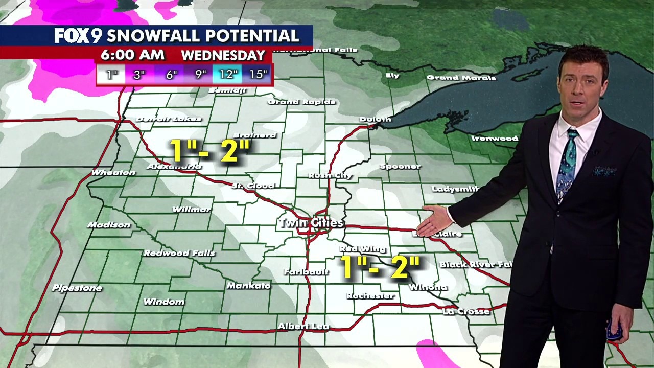 MINNEAPOLIS (FOX 9) - A calm but chilly Tuesday in Minnesota gives way to light snow by the evening before warmer temperatures arrive midweek.