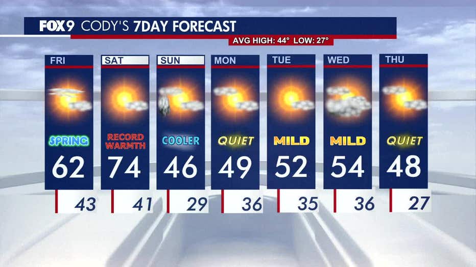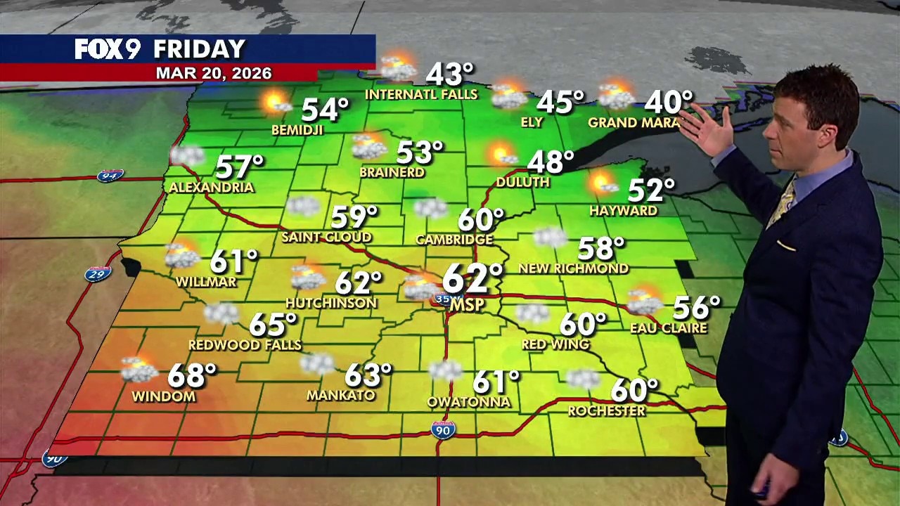 It's a warm start to spring with highs in the 60s on Friday and even warmer 70s on Saturday. FOX 9 meteorologist Cody Matz has the full forecast.