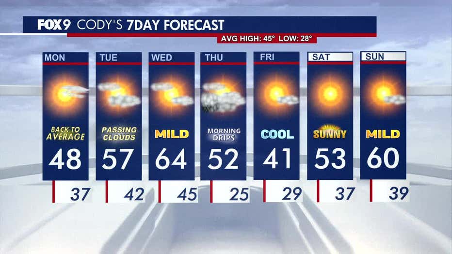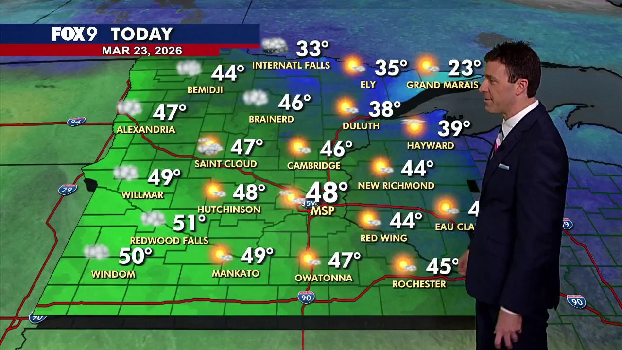 MINNEAPOLIS (FOX 9) - A seasonable Monday brings morning sunshine and highs in the 40s to much of Minnesota before clouds increase in the afternoon.