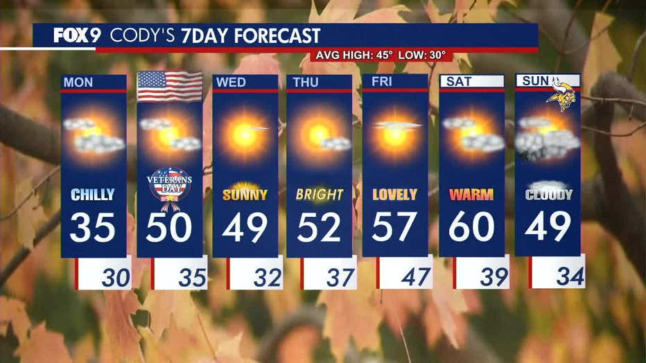 Get ready for a quiet and chilly start to the week with pockets of sunshine and highs in the 30s. The cold weather won't last long, as above-average temperatures are expected to return on Tuesday. FOX 9 meteorologist Cody Matz has the full forecast.