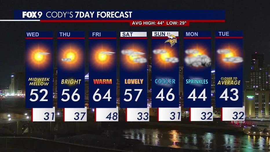 Expect another sunny and pleasantly mild Wednesday, with highs in the 50s, and another chance to see the Northern Lights overnight. FOX 9 meteorologist Cody Matz has the full forecast.