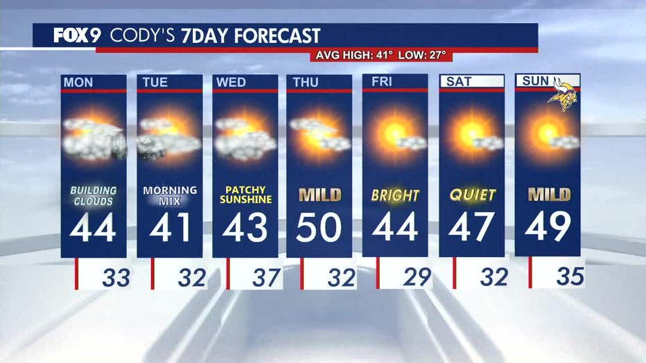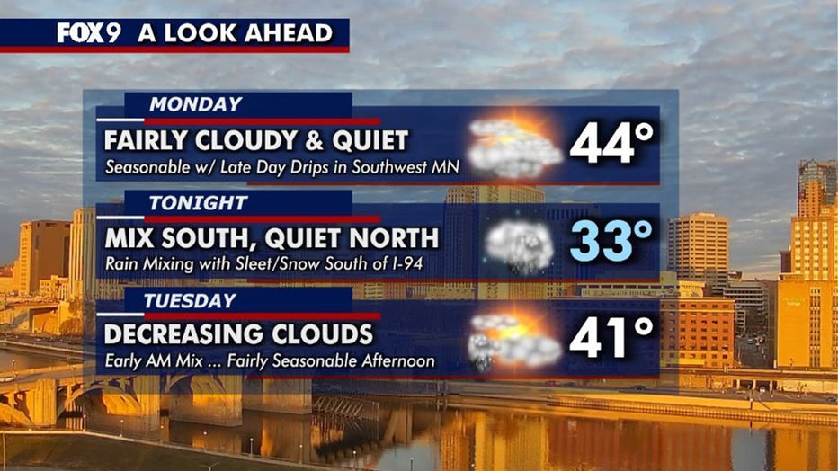 MINNEAPOLIS (FOX 9) - Monday will be fairly cloudy, quiet and seasonable before rain moves into southern Minnesota later in the day, with a changeover to a snowy mix likely Monday night.