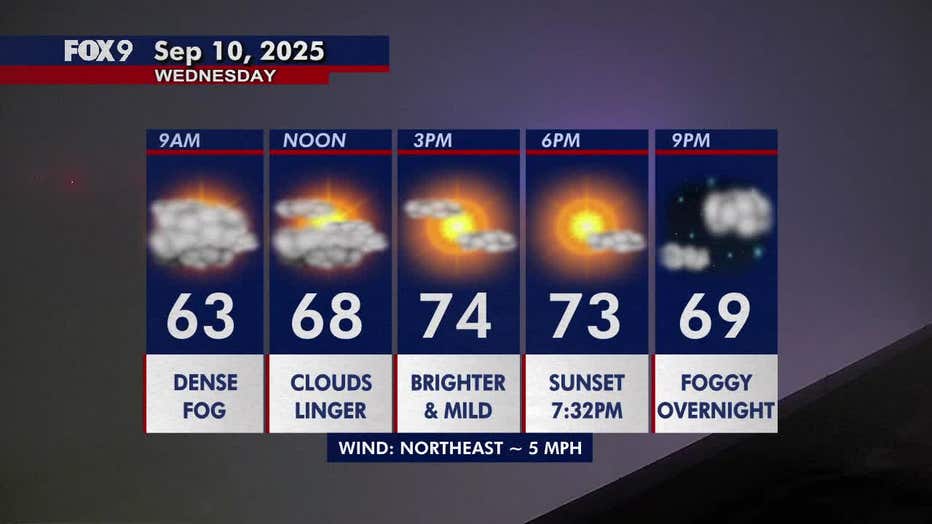 MINNEAPOLIS (FOX 9) - Morning fog and clouds will gradually clear for late-day sunshine and highs in the 70s for much of Minnesota on Wednesday.