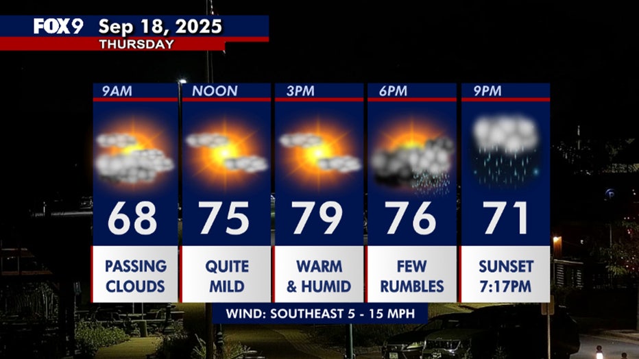 MINNEAPOLIS (FOX 9) - Expect a warm and humid Thursday with a few rumbles and showers possible later in the day.