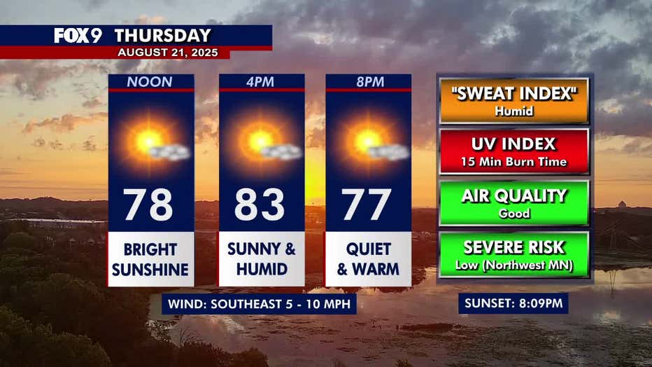 Thursday will be mostly sunny with a southeasterly breeze at 5-10 mph. The Twin Cities metro daytime high is 83 degrees, with dew points in the 60s, making it feel sticky.