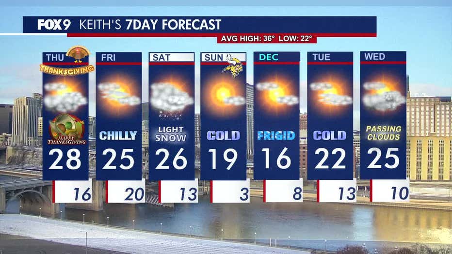 MINNEAPOLIS (FOX 9) - It's going to be a cold and breezy Thanksgiving, with fairly cloudy skies and highs struggling to reach the upper 20s.