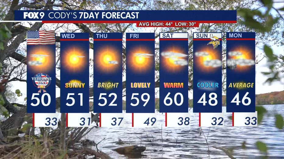 Expect a much warmer, brighter, and breezier Veteran's Day, with highs ranging from the 30s in the north to the 40s and 50s across the rest of the state. FOX 9 meteorologist Cody Matz has the full forecast.