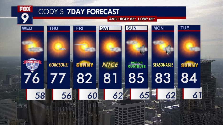 Dew points will tumble into Wednesday afternoon, with breezes keeping temperatures in the 70s with occasional sunshine in the Twin Cities. Overnight, it'll be quiet and cool with a low of around 58 degrees.