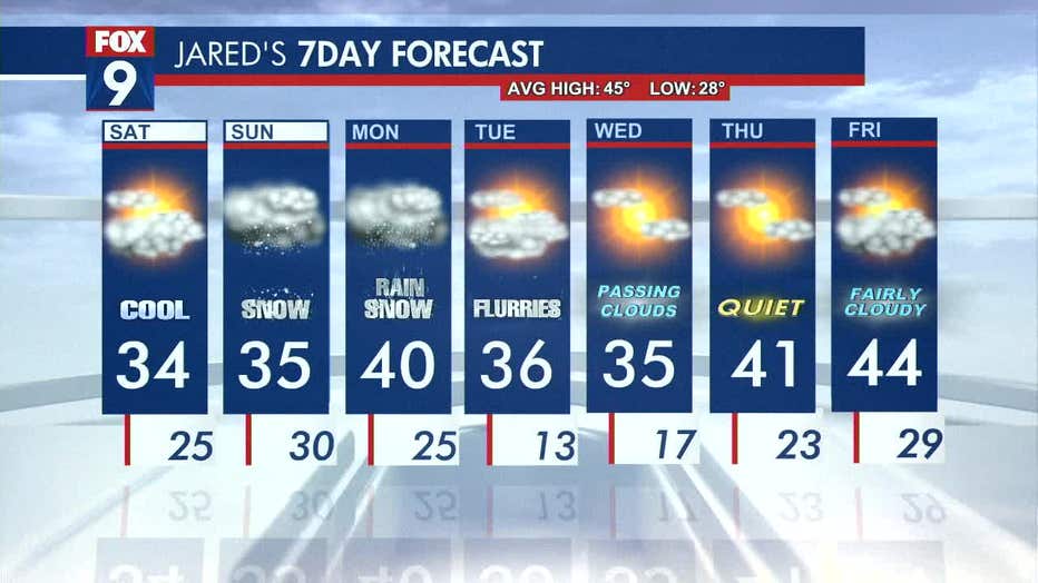 There is plenty of sunshine for Saturday morning before cloud coverage increases during the afternoon. Temperatures are below average with a high of 34 degrees in the Twin Cities metro area. Overnight lows dip to the mid-20s with mostly cloudy skies.
