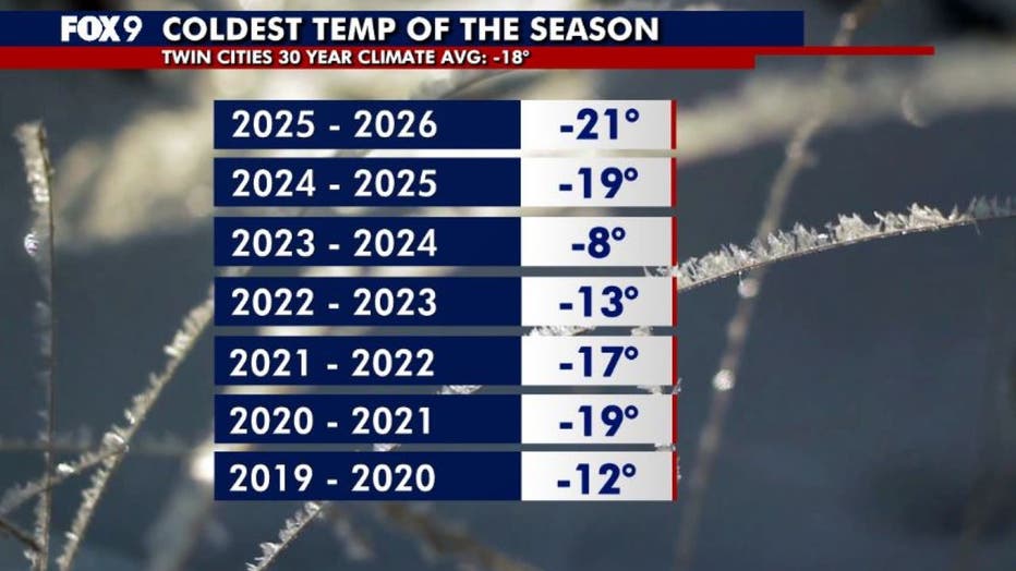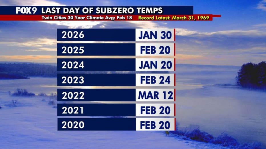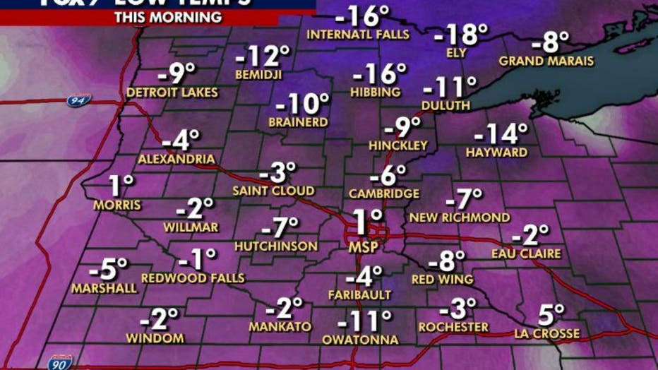 MINNEAPOLIS (FOX 9) - The last of Minnesota's subzero temperatures appeared in many areas Tuesday morning as our deep fresh snowpack, clear skies, and calm winds allowed the minus signs to return briefly.