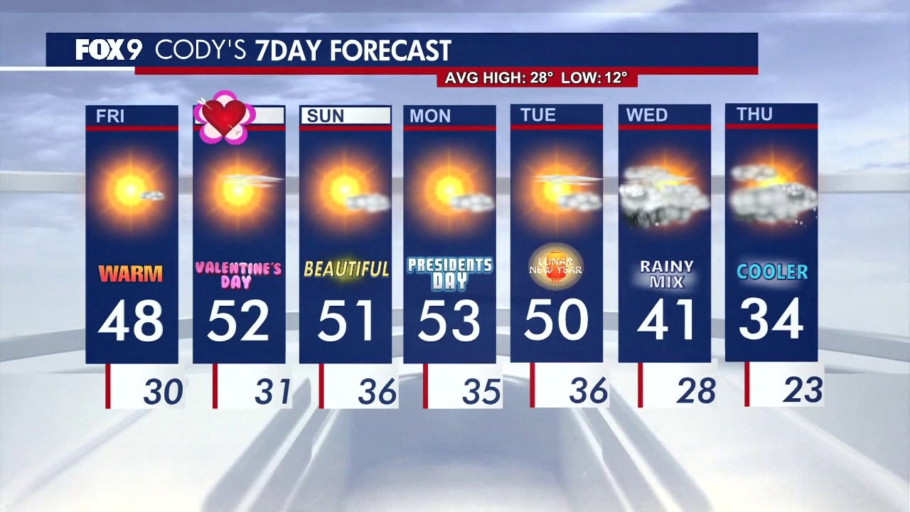 MINNEAPOLIS (FOX 9) - It'll be a warm Valentine's Day weekend with some parts of Minnesota expected to see record-breaking temperatures.