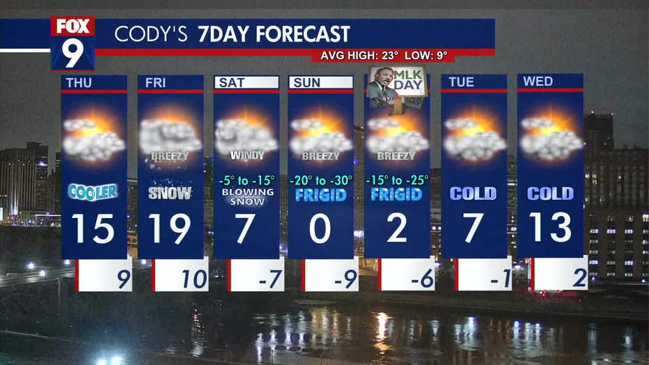 MINNEAPOLIS (FOX 9) - Temperatures will fall on Thursday ahead of some accumulating snow on Friday and even colder temperatures this weekend.