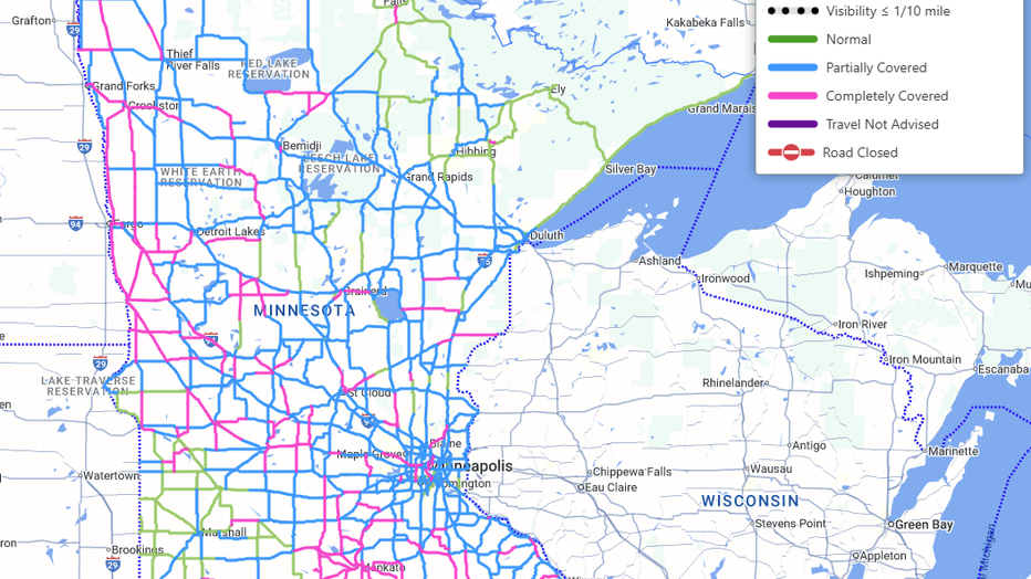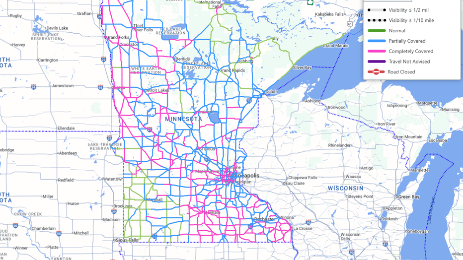 Roadways across much of the Twin Cities metro, central Minnesota and portions of northern Minnesota are covered in snow, which is making driving conditions difficult. Side roads are especially difficult, with some piles of snow or areas that haven't been plowed in the Twin Cities.