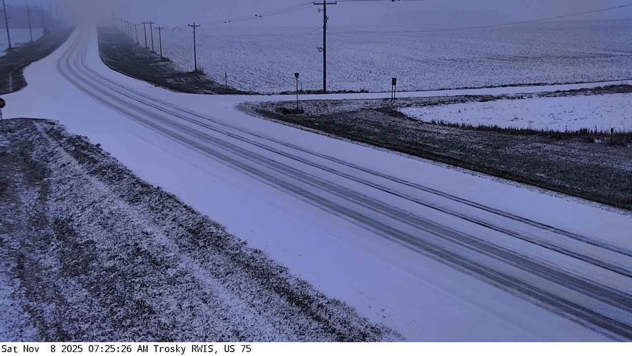 MnDOT traffic camera shows snow on U.S. Highway 75 in Trosky, Minnesota. (Supplied)