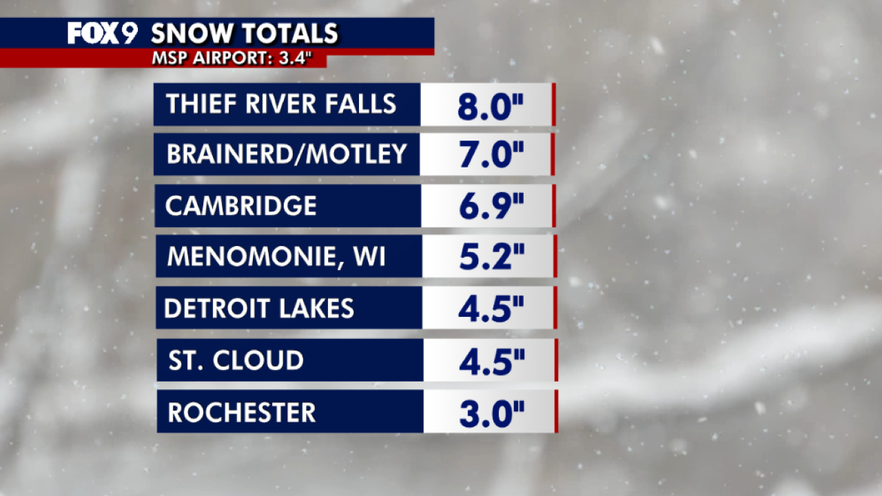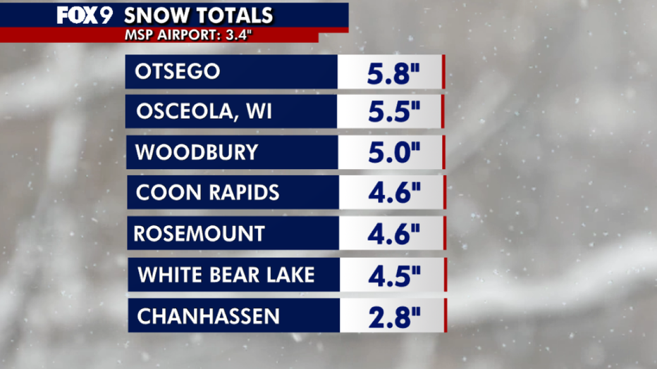 Here's a look at snow totals so far from the Dec. 9-10 storm (these numbers may be updated as additional data comes into the FOX 9 newsroom).