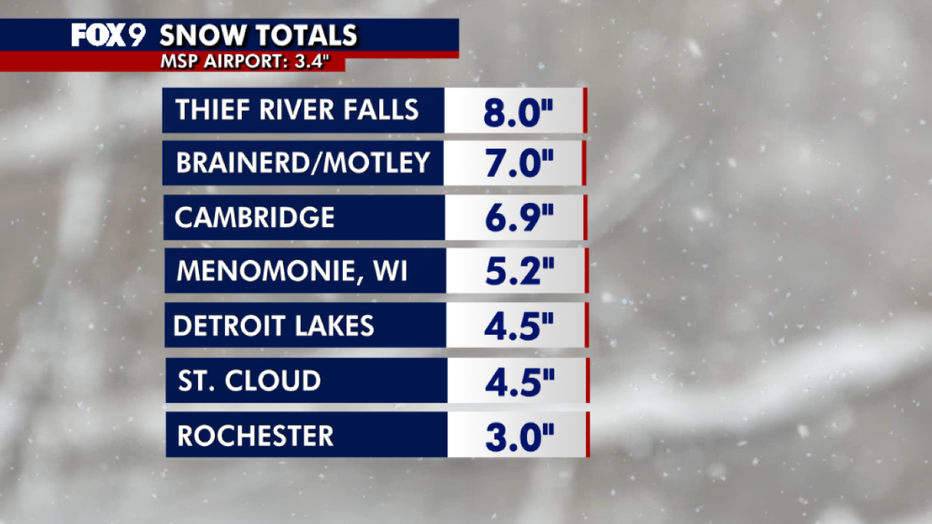 MINNEAPOLIS (FOX 9) - A snowstorm brought several inches of snow to the Twin Cities and greater Minnesota Tuesday and Wednesday morning.