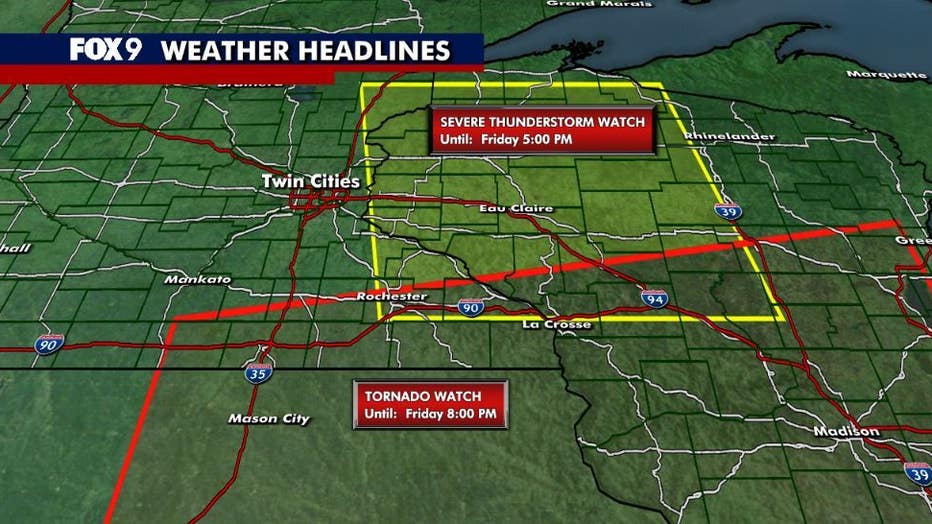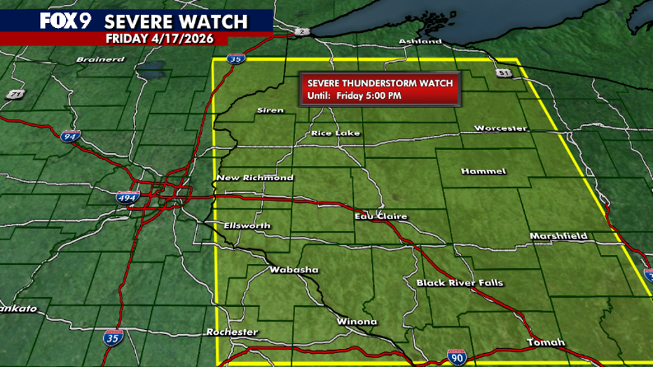 As of 9:30 a.m., there is a severe thunderstorm watch for eastern Minnesota and Western Wisconsin until 5 p.m. Friday. (FOX 9)