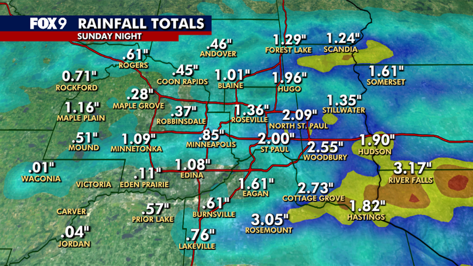 MINNEAPOLIS (FOX 9) - Storms that rolled through Minnesota on Sunday soaked some spots, with two cities reporting more than three inches of rain.