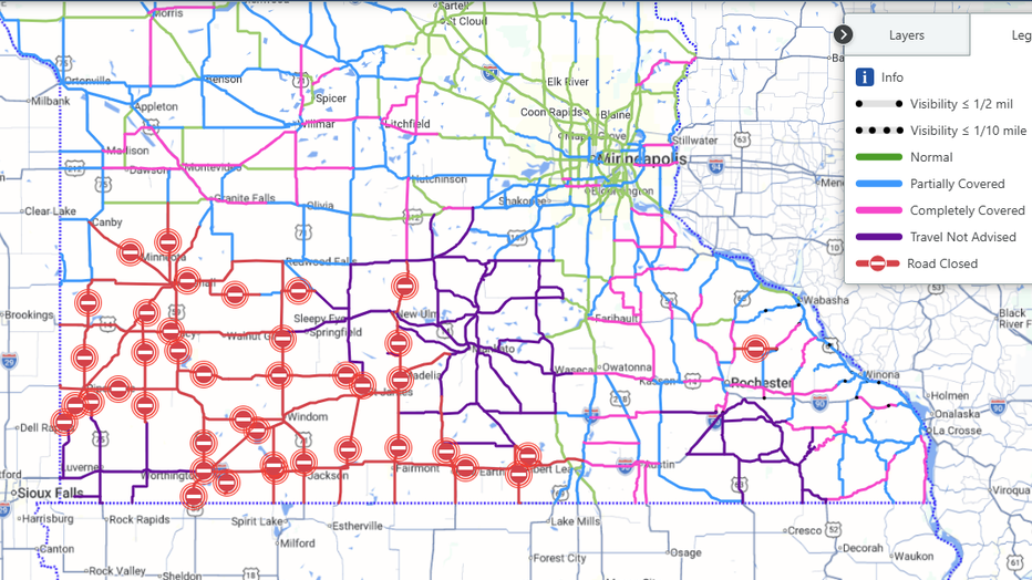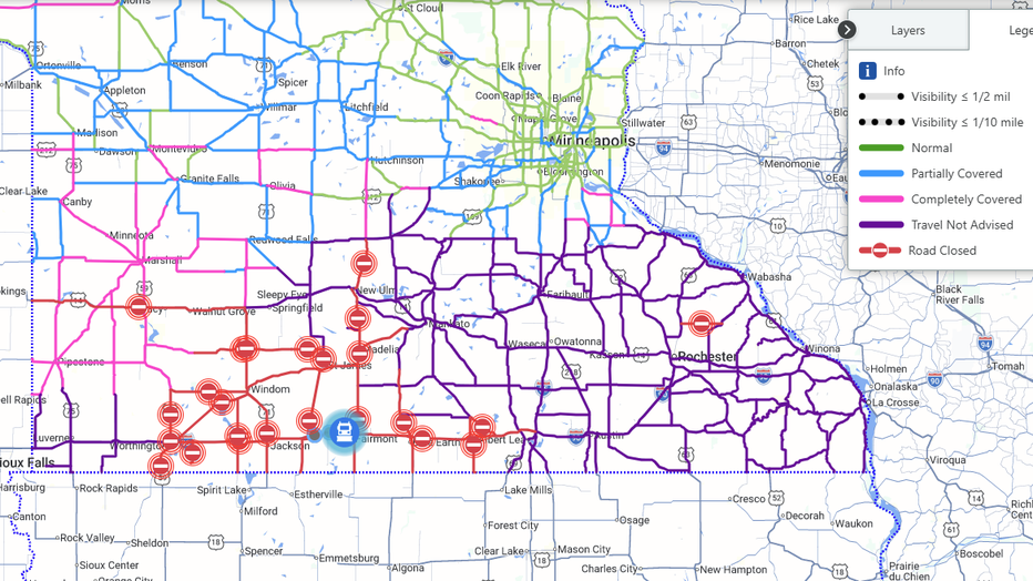 Many roads in southwest Minnesota are closed Monday morning, while roads southeast of the Twin Cities have no travel advisories or are covered in snow.
