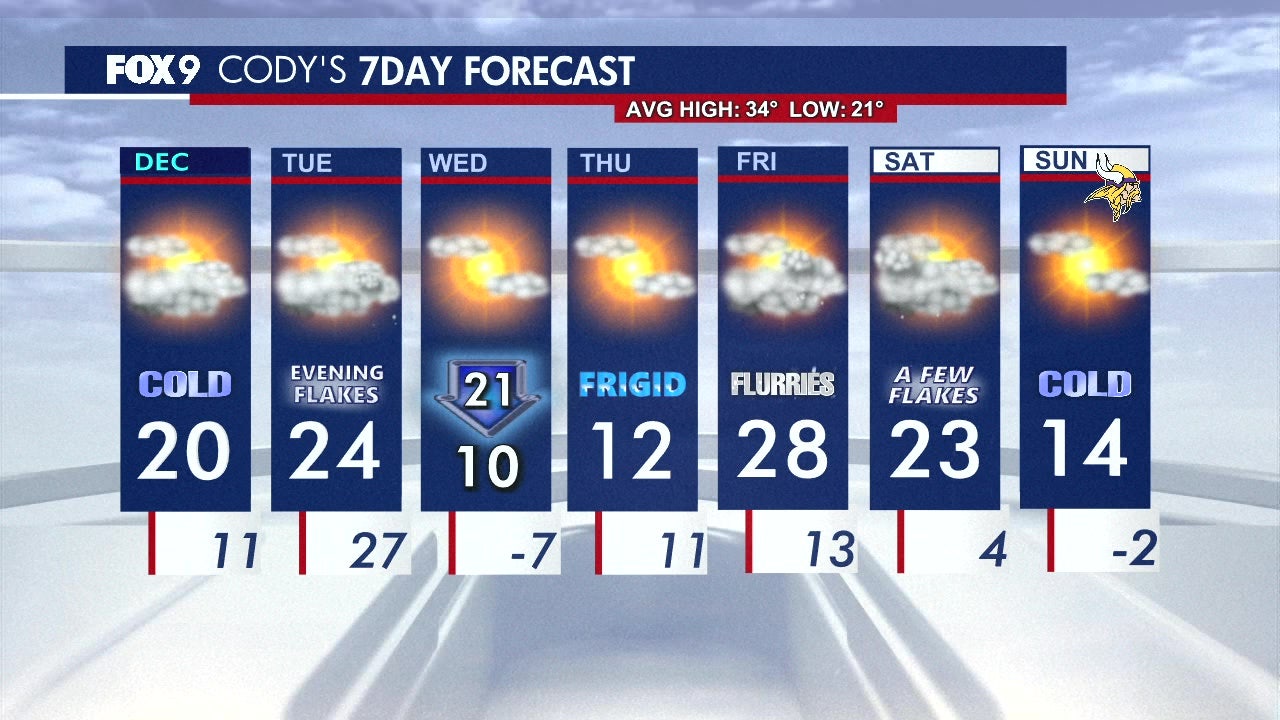 (FOX 9) - Monday will be cold, cloudy with some stray flurries possible before temperatures turn frigid on Wednesday.
