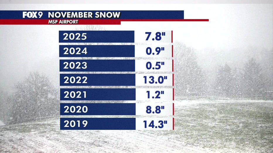 The Twin Cities finished out the month of November with 7.8 inches of snow at the official reporting site at MSP Airport. That is slightly above average and a lot more than the last couple of years, when we got less than an inch of snow. But, not a huge amount in the grand scheme of things. In 2022, we saw 13 inches of snow in November. In 2019, we saw 14.3 inches of snow during the month.