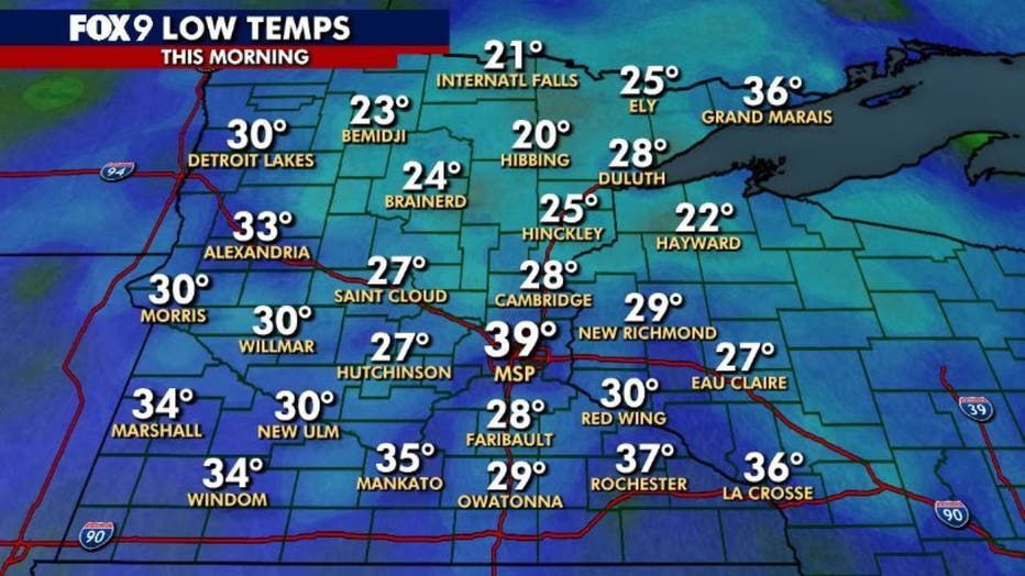 MINNEAPOLIS (FOX 9) - It was the chilliest morning of the season so far in Minnesota on Wednesday, with freeze and frost warnings in effect for some areas. Here's a look at lows across the state.