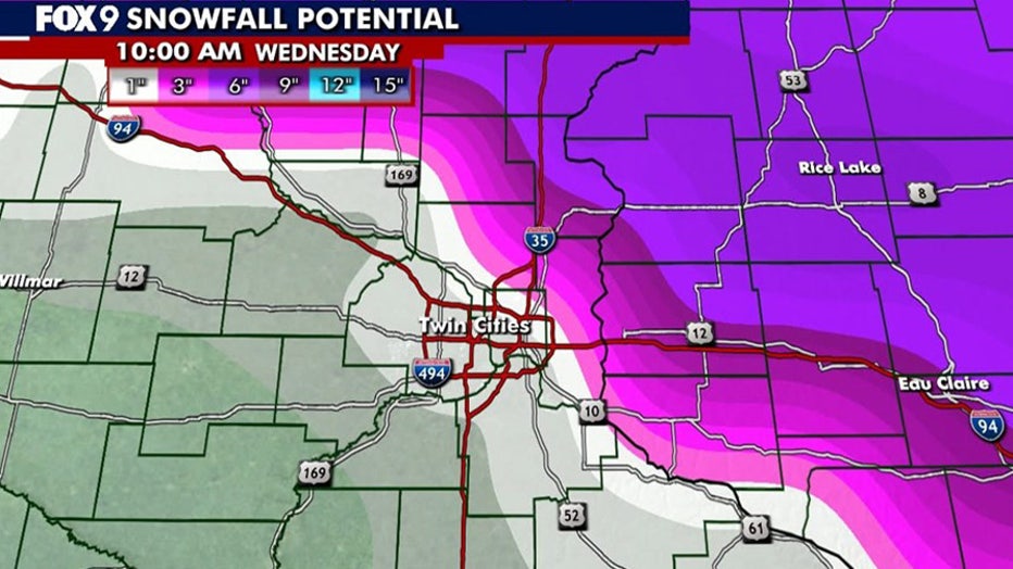 At this point, the track looks to be roughly along I-94, which means the heaviest snow would be along and north of that track, with the latest shift potentially bringing heavier snow to the northeast metro, and more of a rain/wintry mix to the southwest.